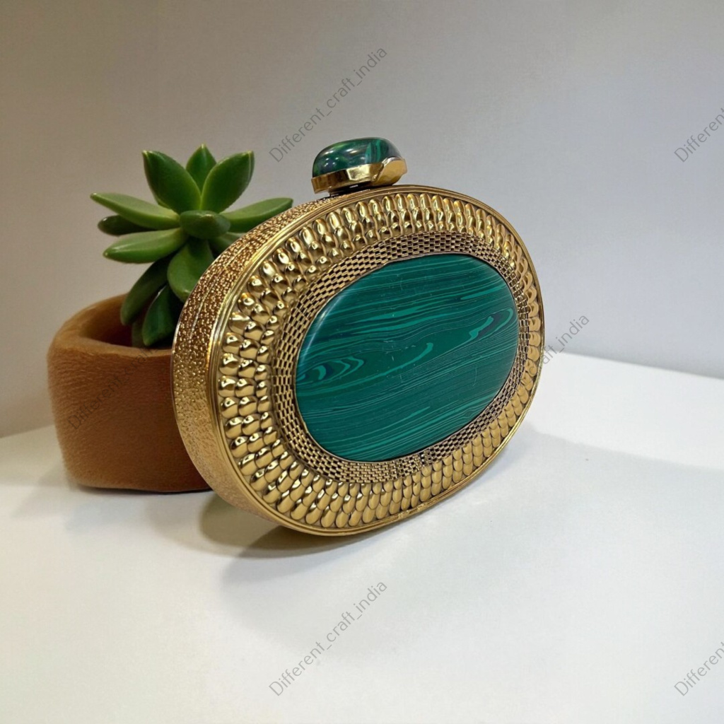 Step into the spotlight with this Handcrafted Oval Malachite Gemstone Embellished Clutch, a luxury accessory designed for women who appreciate exclusivity and refined craftsmanship. More than just a clutch bag, this piece feels like wearable art—akin to carrying fine jewelry. Its sculptural oval silhouette, rich green gemstone, and elegant brass accents ensure a striking presence that turns heads at every event.
