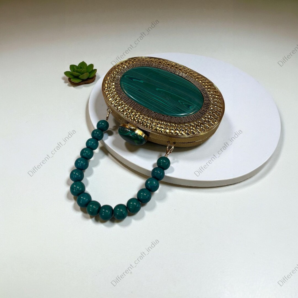 The deep green malachite gemstone makes this clutch a stunning choice for weddings and bridal celebrations. It pairs beautifully with gold jewelry and richly embellished outfits, making it ideal for bridesmaids, wedding guests, and festive family functions.