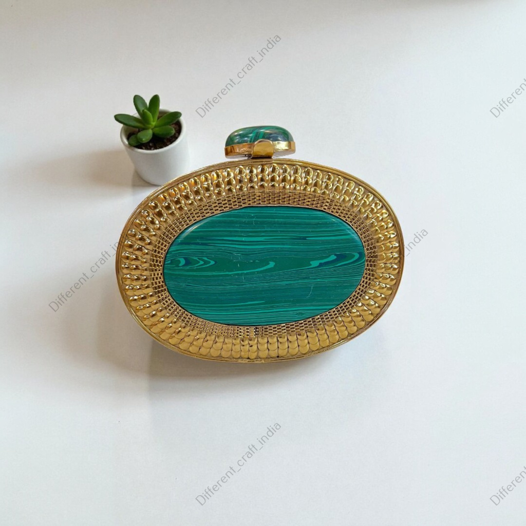 Handcrafted Oval Malachite Gemstone Embellished Clutch with Textured Gold-Tone Brass Accents