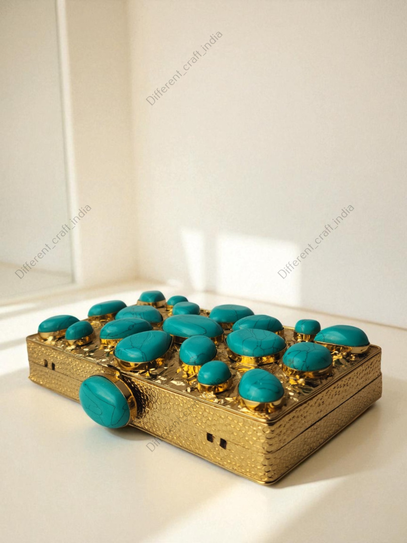 Be the first to review “Natural Turquoise Gemstone Luxury Clutch Bag with a Textured Gold-Tone Brass Frame”