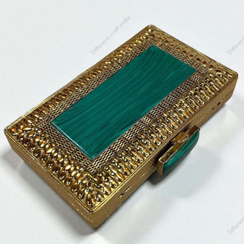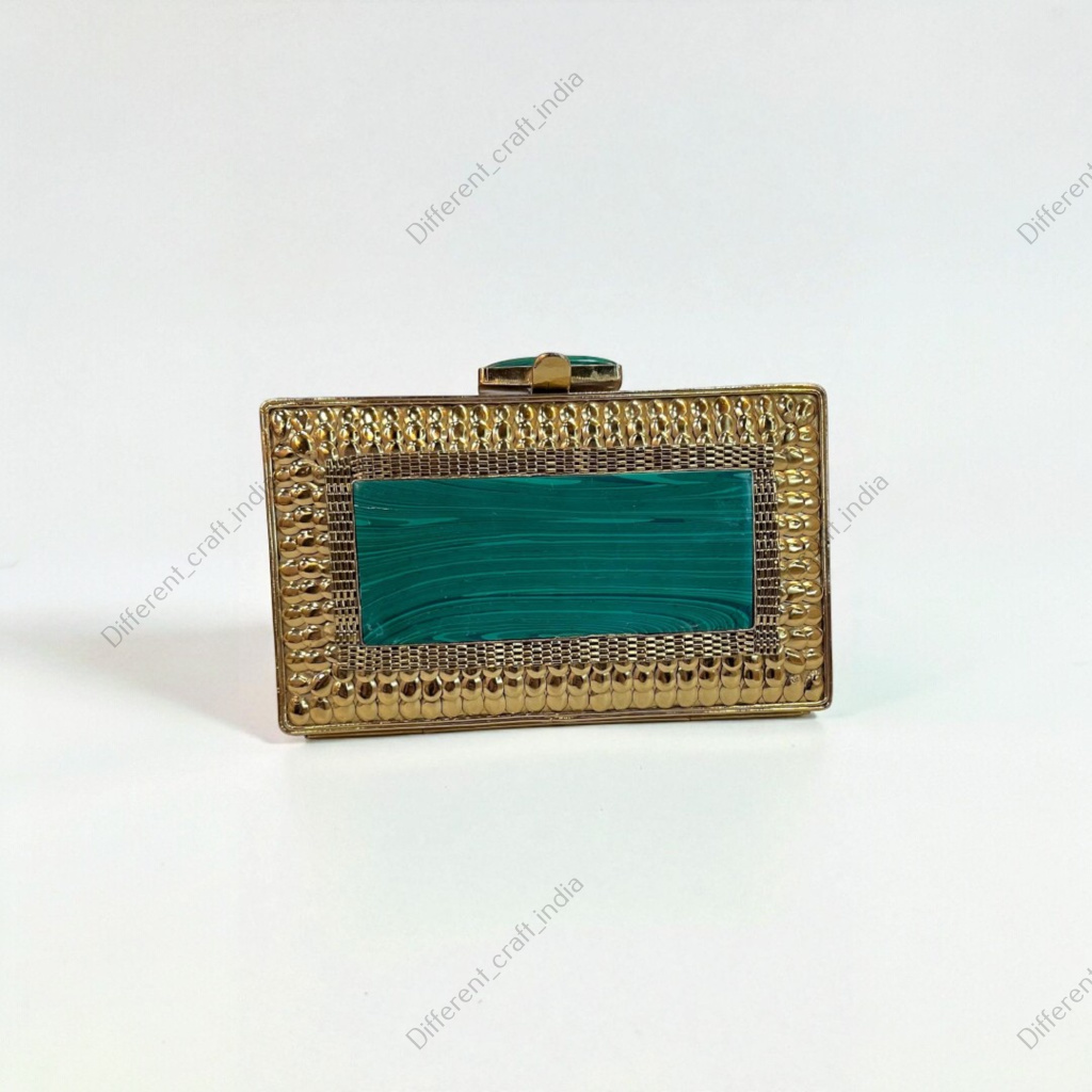The gemstone is beautifully framed with ornate gold-tone brass detailing, adding warmth and contrast to the cool green stone. A matching malachite stone knob completes the design, enhancing the clutch’s luxurious and cohesive aesthetic.