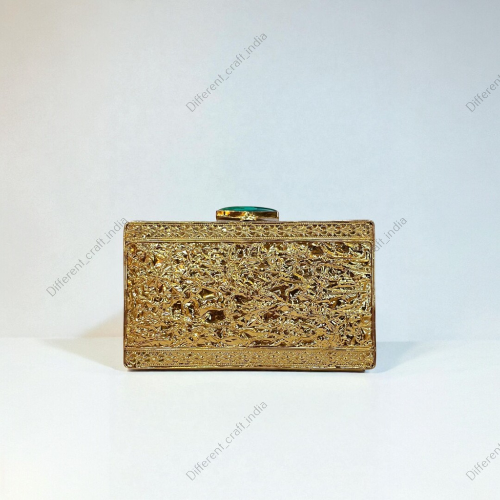This designer evening clutch transitions seamlessly from cocktail parties to formal dinners and gala nights. Its structured rectangular shape and gemstone centerpiece complement both traditional and modern outfits, ensuring a polished and trendsetting appearance.