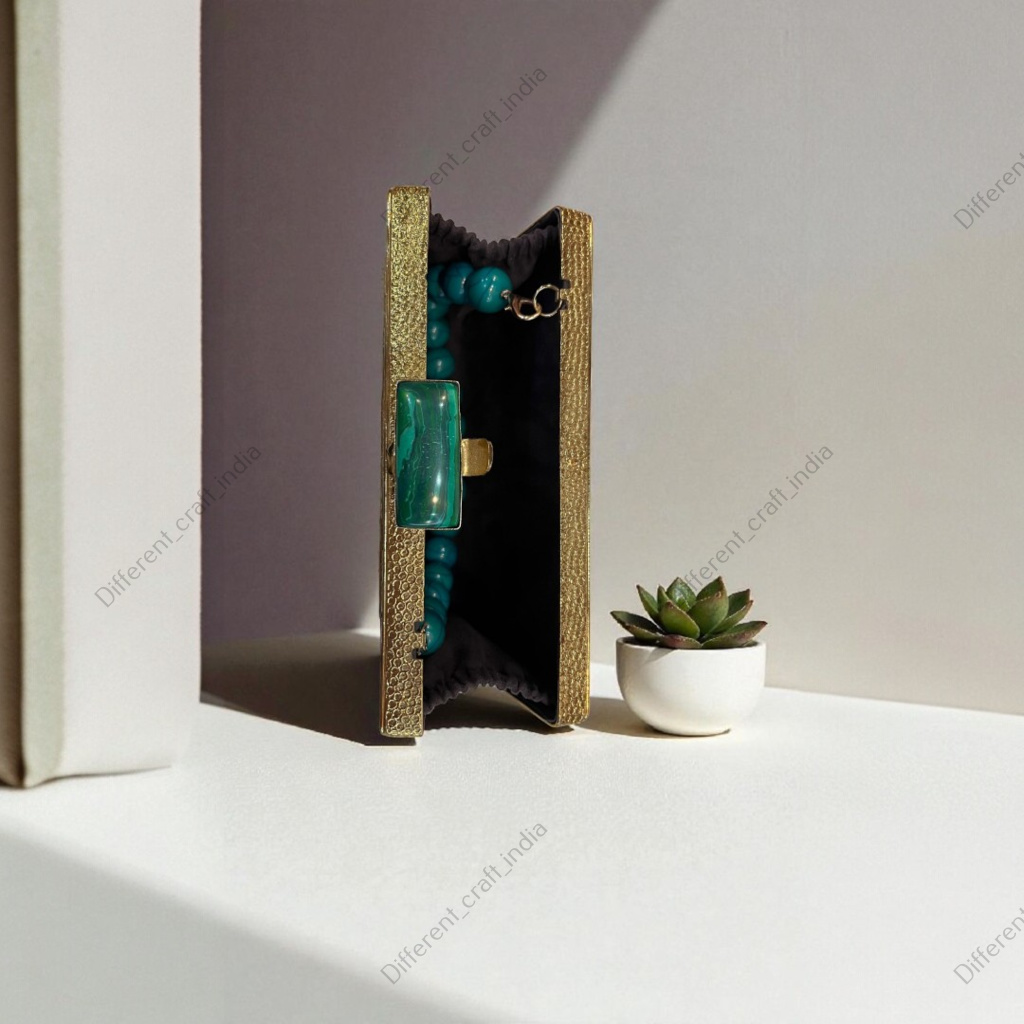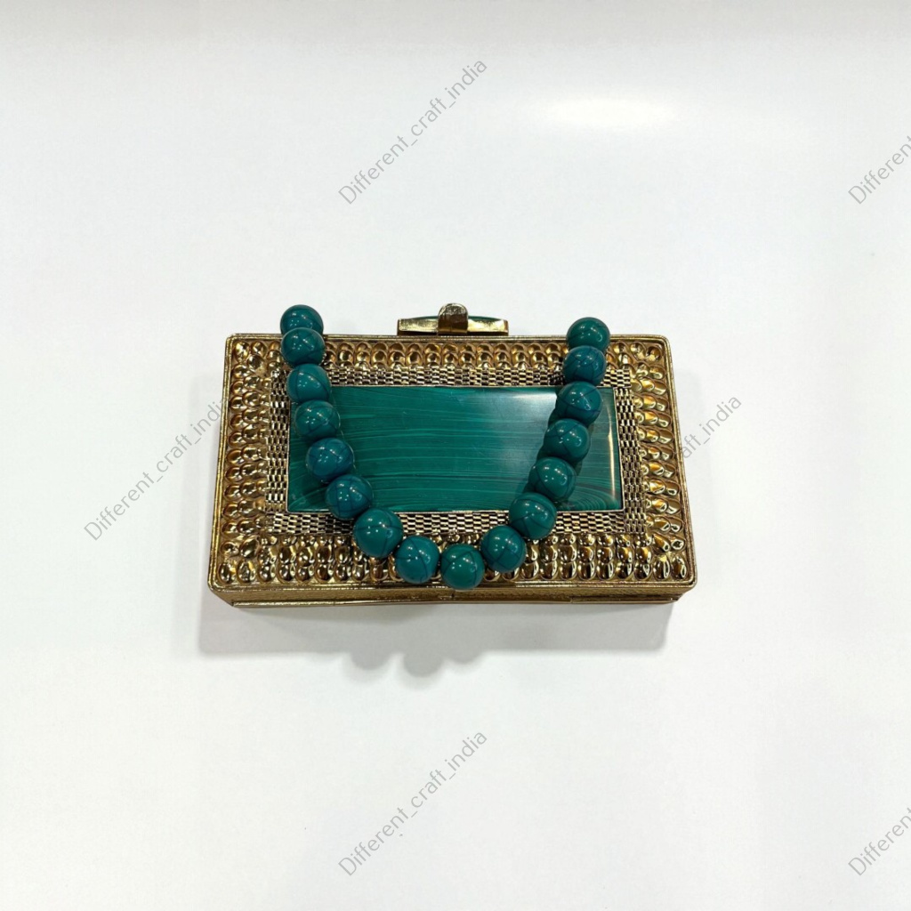 Malachite Gemstone Designer Clutch crafted with natural malachite stones and refined brass detailing, offering a luxurious statement piece for bridal wear, formal events, and evening parties.